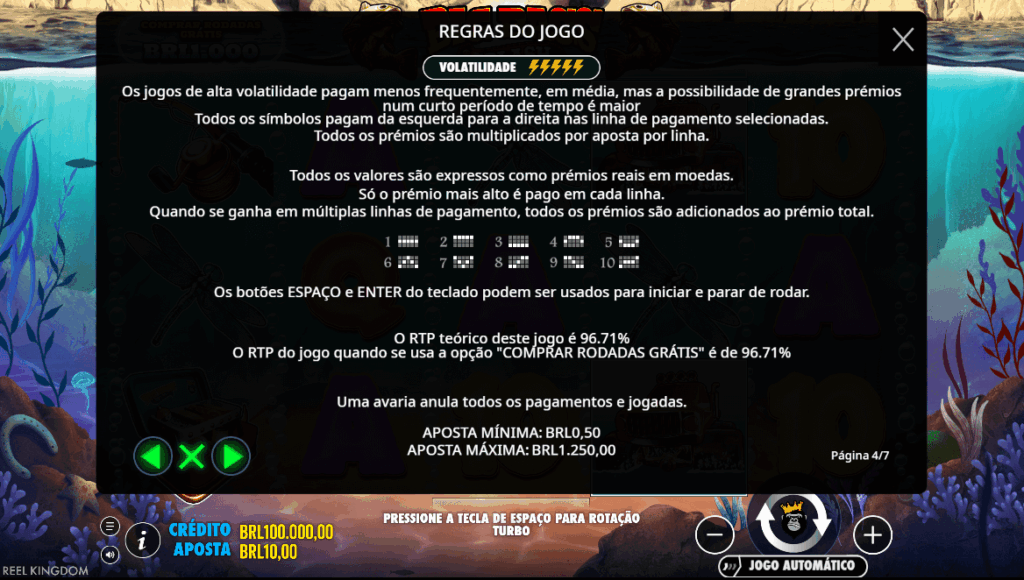 - Para iniciar o jogo, ajuste o valor da aposta. O mínimo que você pode executar é R$ 0,50 e o máximo é R$ 1.250.