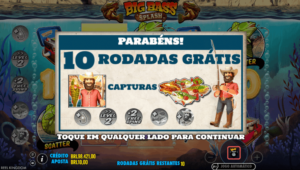Por outro lado, o símbolo Scatter é representado pelo peixe robalo enganchado na vara de pescar e pulando para fora da água. Este espécime impressionante é a chave para desbloquear o recurso de Giros Grátis, graças ao qual você pode ganhar até 5.000x a sua aposta. Repleto de recursos atraentes, você também encontrará multiplicadores crescentes, símbolos empilhados, boosters ou triggers e poderá subir de nível.